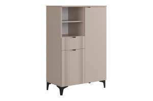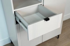 Дизайн комода продуман до мелочей: с одной стороны расположена глухая дверца, за которой скрывается просторное пространство для хранения. С другой стороны – ниша с открытой полкой, выкатной ящик и ещё одна глухая дверца, что позволяет гибко организовать хранение и поддерживать порядок в доме.