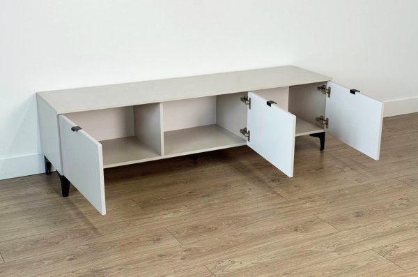 Тумба оснащена тремя распашными дверцами, которые открывают доступ к просторным внутренним полкам, идеально подходящим для хранения посуды, бытовой техники, аксессуаров или других предметов. Металлические ручки придают изделию современный вид и удобство в использовании.