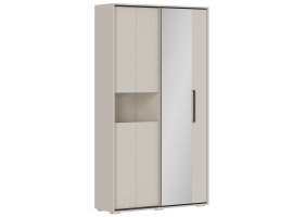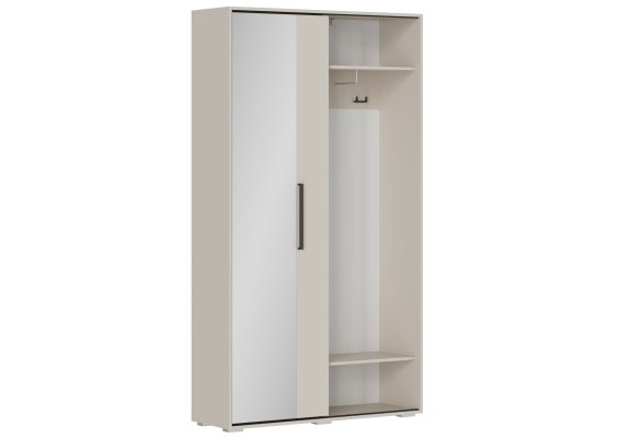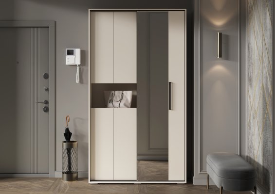 Разделение на секции: Одна часть прихожей включает две одинаковые секции с полками, закрытые створками. В каждой секции предусмотрено по две съёмные полки, что позволяет настраивать пространство под ваши нужды. Открывание створок осуществляется за выступ, что делает использование шкафа более удобным.