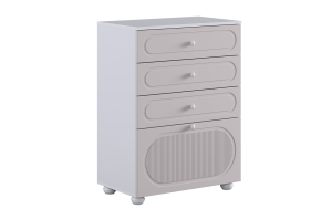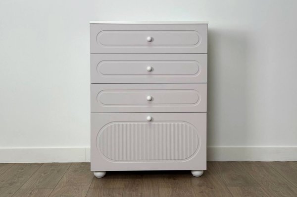 Корпус комода выполнен из ЛДСП толщиной 16 мм, фасады изготовлены из МДФ в плёнке ПВХ. Фасады с фрезеровкой подчёркивают аккуратный внешний вид изделия. Оригинальные круглые ручки и опоры придают комоду современный и лёгкий характер, делая его гармоничной частью детского интерьера.