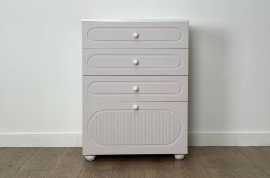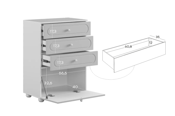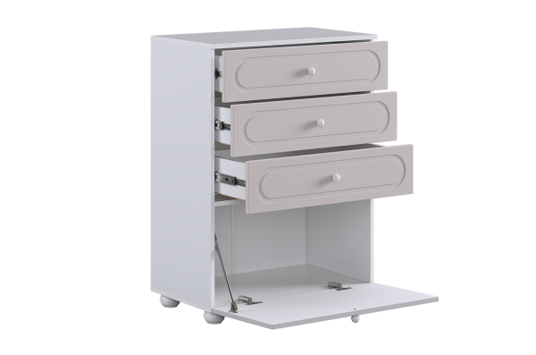 Комод оснащён тремя выкатными ящиками на шариковых направляющих, обеспечивающими плавный и надёжный ход. Ящики подойдут для хранения одежды, белья, аксессуаров или игрушек. В нижней части расположена вместительная откидная секция, предназначенная для более габаритных предметов и сезонных вещей.