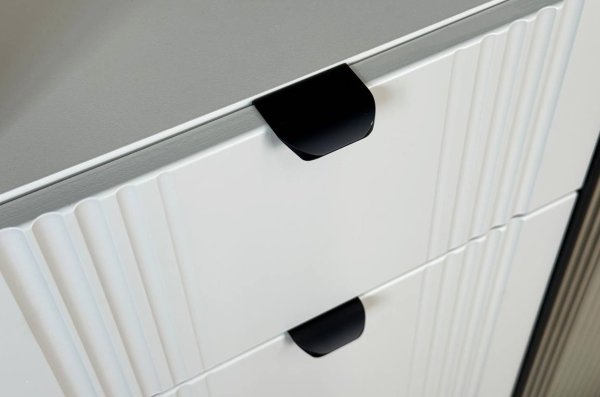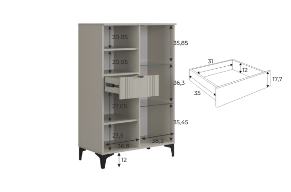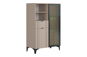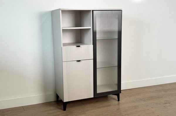 Дизайн комода продуман до мелочей: с одной стороны расположена стеклянная дверца, за которой находится просторное пространство для хранения. С другой стороны – ниша с открытой полкой, выкатной ящик и ещё одна глухая дверца, что позволяет гибко организовать хранение и поддерживать порядок в доме.