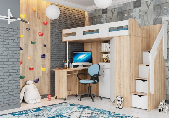 Благодаря универсальной сборке и универсальному углу, эту кровать-чердак можно легко адаптировать под планировку комнаты. Значит, даже в небольшой комнате она будет смотреться уместно и не займёт слишком много места, оставив пространство для игр или других активностей.