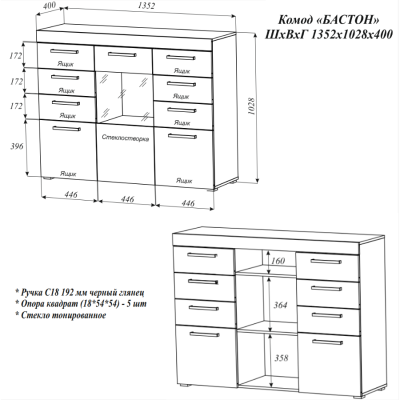 Комод Бастон — практичное и стильное решение для хранения вещей. Выдвижные ящики обеспечивают быстрый доступ к содержимому. Вставка из стекла создает необычный акцент в интерьере и позволяет продемонстрировать ценные книги или предметы декора. Современный дизайн станет частью меблировки комнаты.