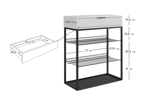 Обувница Вельвет прекрасно сочетает в себе стиль и функциональность. Её дизайн в стиле лофт идеально подходит для современных интерьеров. Выдвижной ящик с шариковыми направляющими обеспечивает бесшумное и плавное открывание, предоставляя удобный доступ к вашим аксессуарам и мелочам. Регулируемые опоры и специальный коврик обеспечивают дополнительный комфорт и защиту.