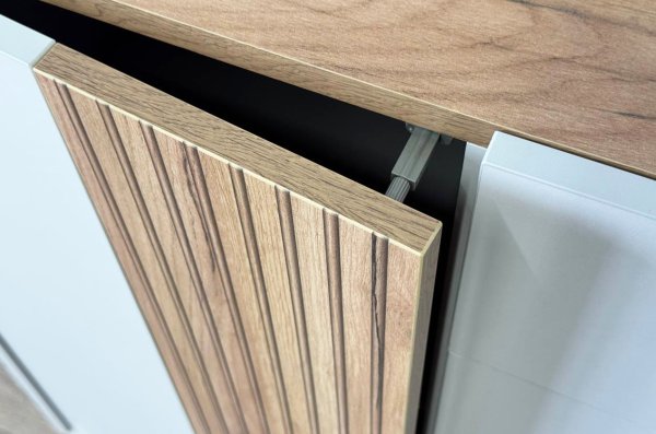 С другой стороны комод оборудован выкатным ящиком, который обеспечивает легкий доступ к часто используемым предметам. Под ним расположен большой глухой фасад, скрывающий за собой просторное хранилище для более крупных вещей.