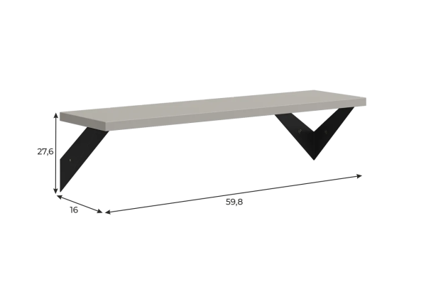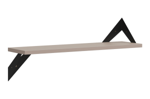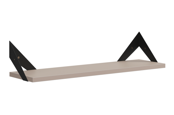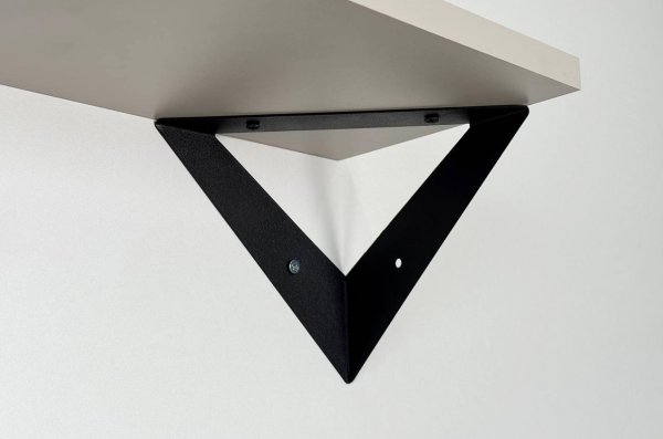 Полка крепится к стене с помощью чёрных треугольных держателей, которые обеспечивают устойчивость и долговечность. Особенность модели в том, что держатели можно расположить сверху, снизу или один сверху, другой снизу, что позволяет адаптировать полку под любые интерьерные решения и потребности.