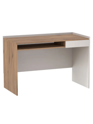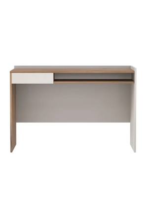 Прямой письменный стол имеет один выдвижной ящик (возможно правое и левое его расположение) и открытую нишу (полку) для хранения. По двум сторонам столешницы расположены невысокие бортики.