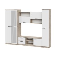 - Гостиная состоит из трёх модулей (шкаф платяной, шкаф бельевой, средняя секция), которые при желании можно устанавливать отдельно друг от друга, размещая в разных комнатах