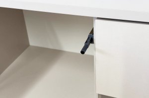 Другая сторона комода оснащена выкатным ящиком и фасадом со стеклом, обладающим зеркальным эффектом. Это не только добавляет современности и шарма, но и обеспечивает дополнительное пространство для хранения декоративных предметов и книг.