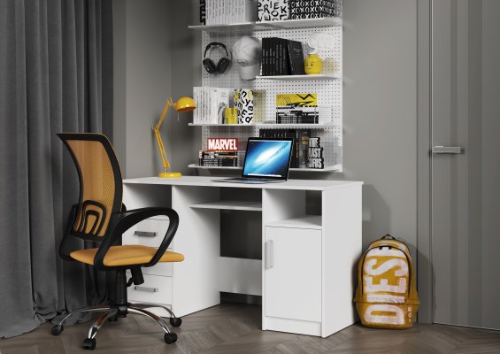 Он состоит из двух тумб, расположенных по краям, и столешницы, обеспечивающей достаточно места для работы и учебы. Открытые ниши, расположенные под столешницей над каждой из тумб идеально подходят для хранения книг, документов или других необходимых вещей, которые всегда должны быть под рукой.