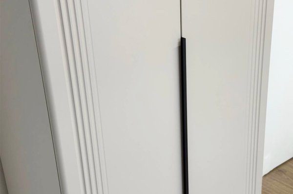 Корпус шкафа изготовлен из ЛДСП, что гарантирует прочность и долговечность. Фасад, покрытый МДФ в плёнке ПВХ, не только выглядит эстетично, но и защищает шкаф от повреждений. Особое внимание заслуживает фрезеровка фасадов, которая придаёт шкафу изысканный вид.