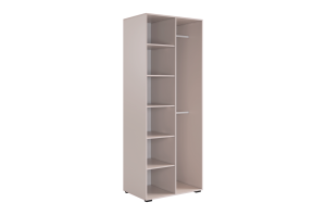 Шкаф оснащён длинными пластиковыми ручками и имеет удобное внутреннее наполнение: слева расположены полки, а справа — две штанги для вешалок. Это позволяет рационально использовать пространство и разместить различные типы одежды.